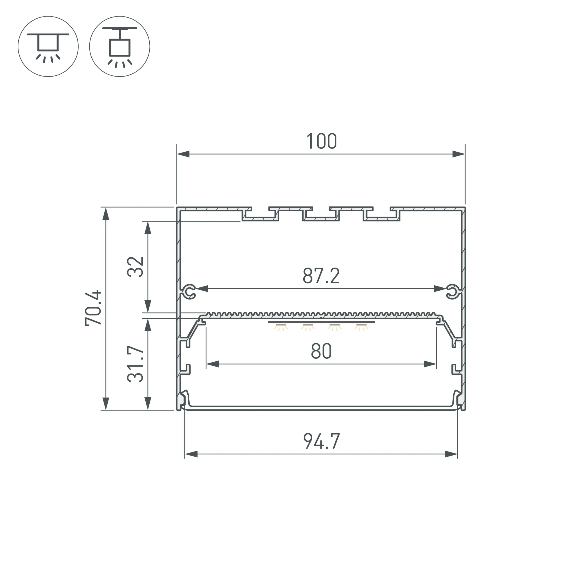 Алюминиевый профиль для светодиодных лент и линеек. Цвет - черный RAL9004 (порошковая окраска). Габаритные размеры (L×W×H): 2000x100x70,4 мм. Ширина площадки для ленты 80 мм. Размер отсека для блока питания: 87,2х32 мм. Экраны, заглушки и другие аксессуары приобретаются отдельно. Цена за 1 метр.